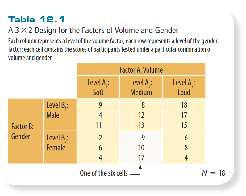 This is how we set up this experiment. A cell is (e.g. 9,10,17; 3 people who were female and listened to something at medium volume).